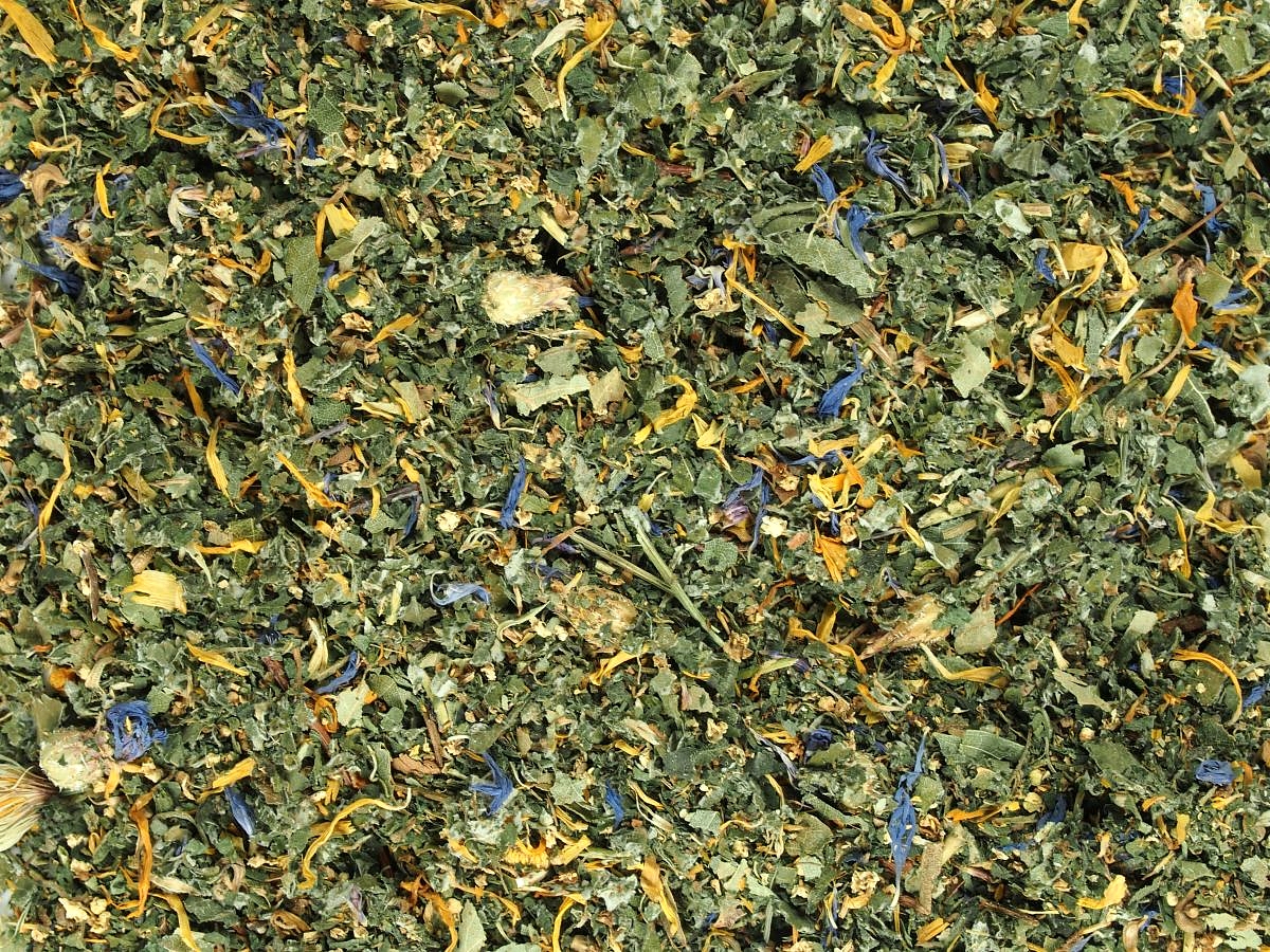 Směs natě kopřivy, květů černého bezu, listů maliníku, květů měsíčku, listů břízy a květů chrpy k pročištění organizmu.