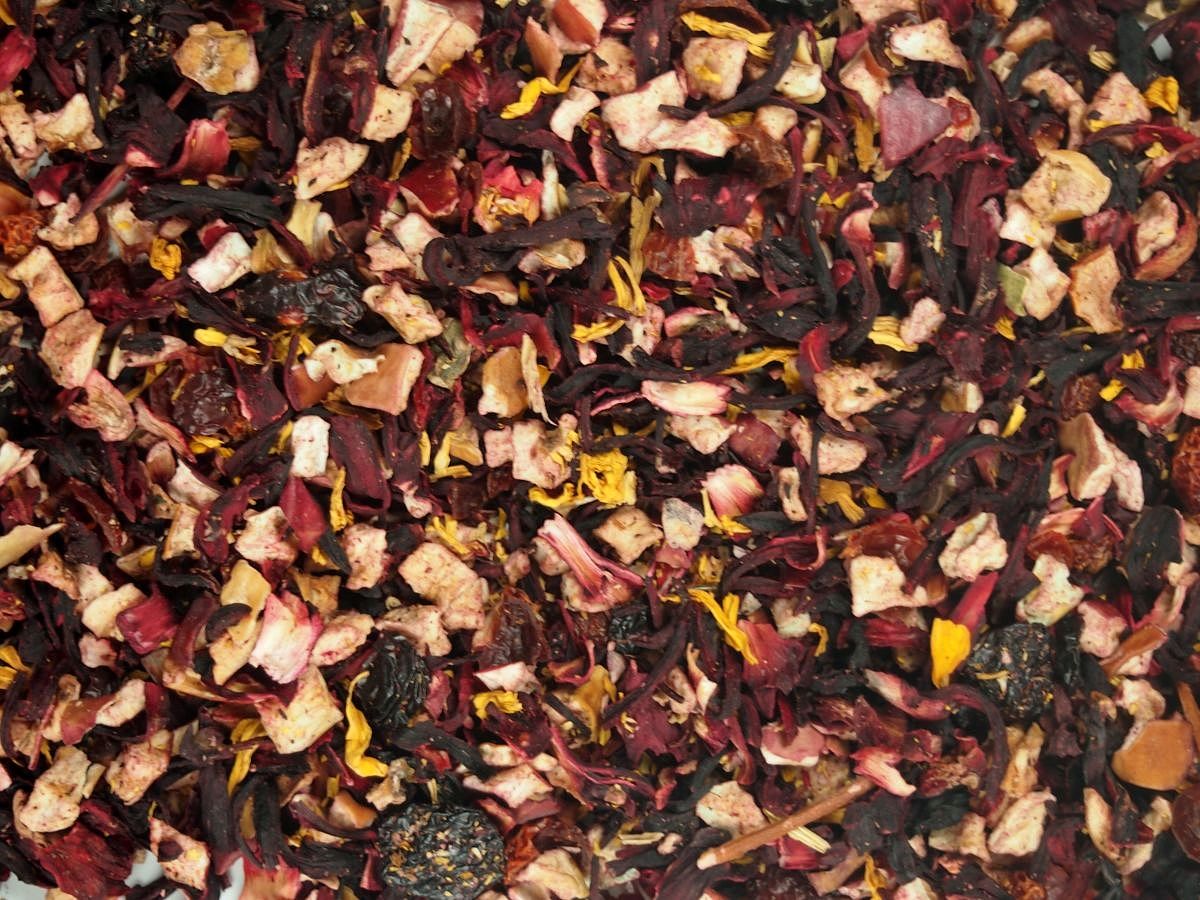 Složení: bezinky, rozinky, šípek, jablka, ibišek, višně (min.8,5%) (višně, cukr, slunečnicový olej), černý rybíz, aroma, květy a listy hlohu.