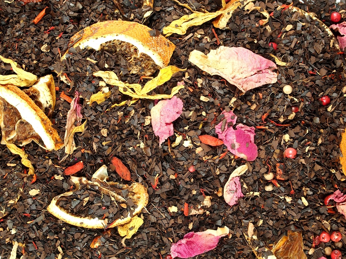 Složení: pražené mate (min. 68,2 %), zázvor, aroma, plátky pomeranče, bílý pepř, plody goji (kustovnice čínská), červený pepř, pivoňka, santalové dřevo, chilli papričky, květy bodláku, slunečnice. Může obsahovat stopy suchých skořápkových plodů.