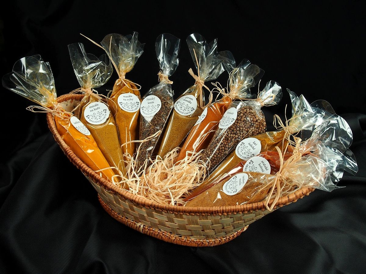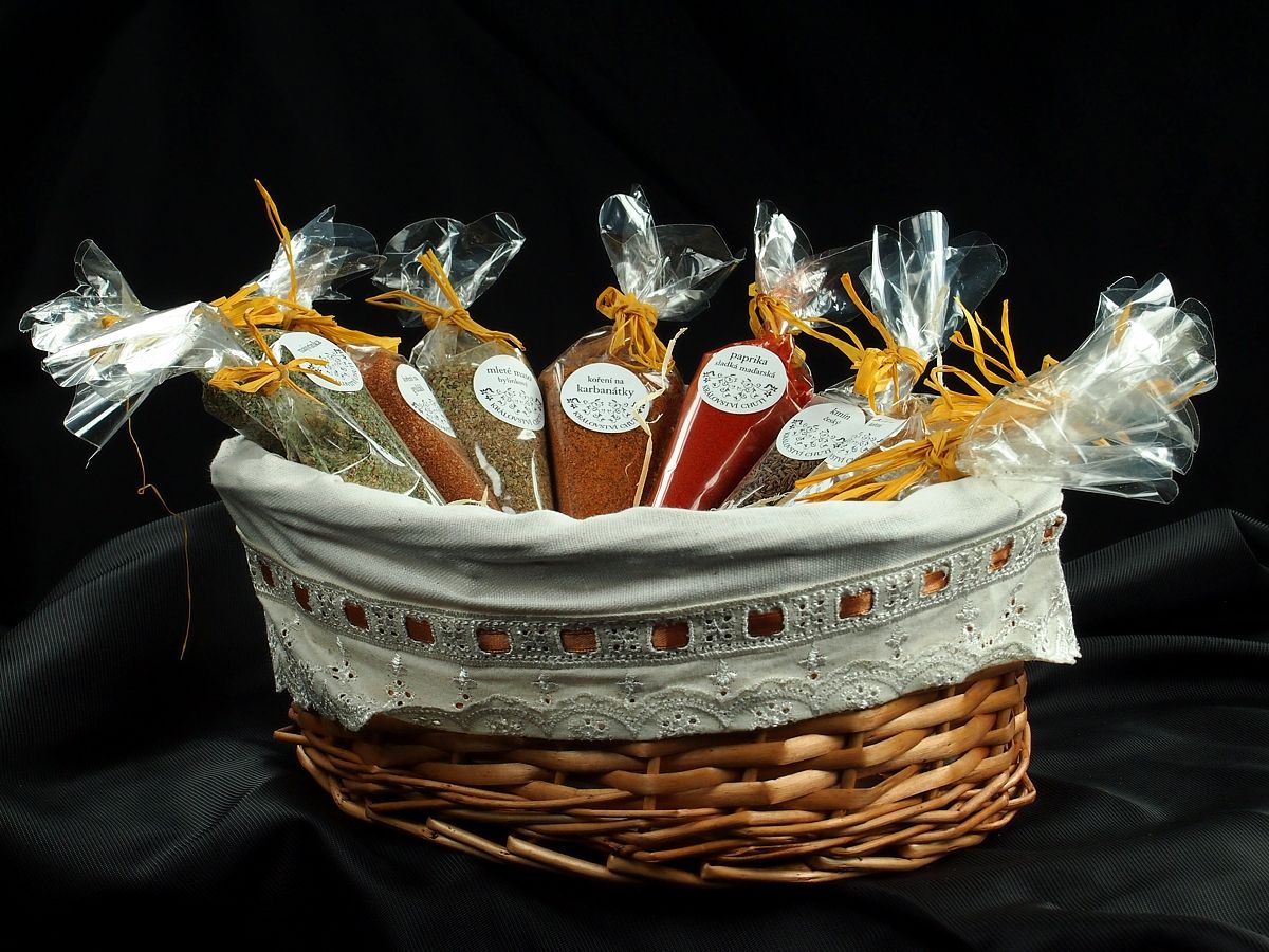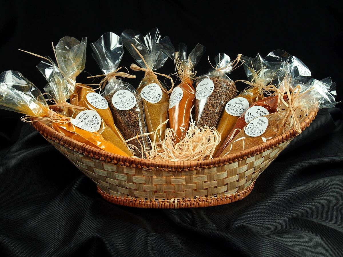 Dárkové košíky jsou jako dárek velmi oblíbené a s naším ne zcela tradičním obsahem zaujmou i originalitou. Je z čeho vybírat, nabízíme např. sady koření české, orientální či italská kuchyně, koření na sladké pečení, koření pro vegetariány či ostré koření, ale též sypané čaje, kávu, ořechy a sladkosti nebo třeba bylinky. Dárkový košíček je pak skutečně dárkem pro každou příležitost. Košíky lze vybírat z různých velikostí od košíčků na pět balíčků až po velké koše pro 50 – 80 položek. Široká možnost výběru velikosti košíku a jeho obsahu umožňuje snadné přizpůsobení dárku požadované ceně.