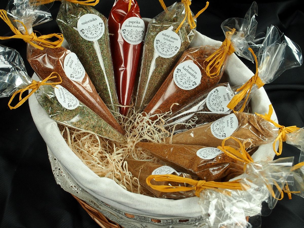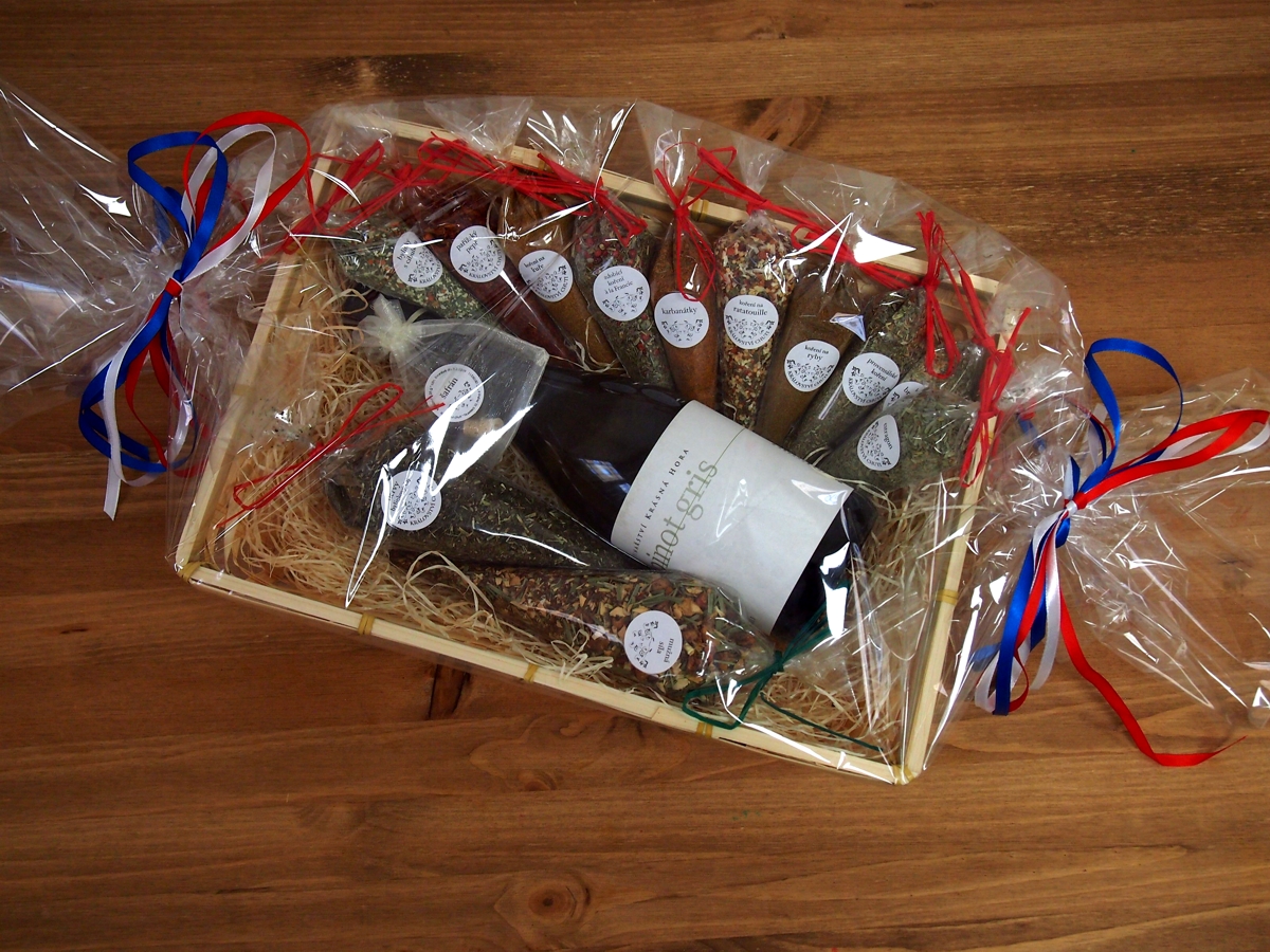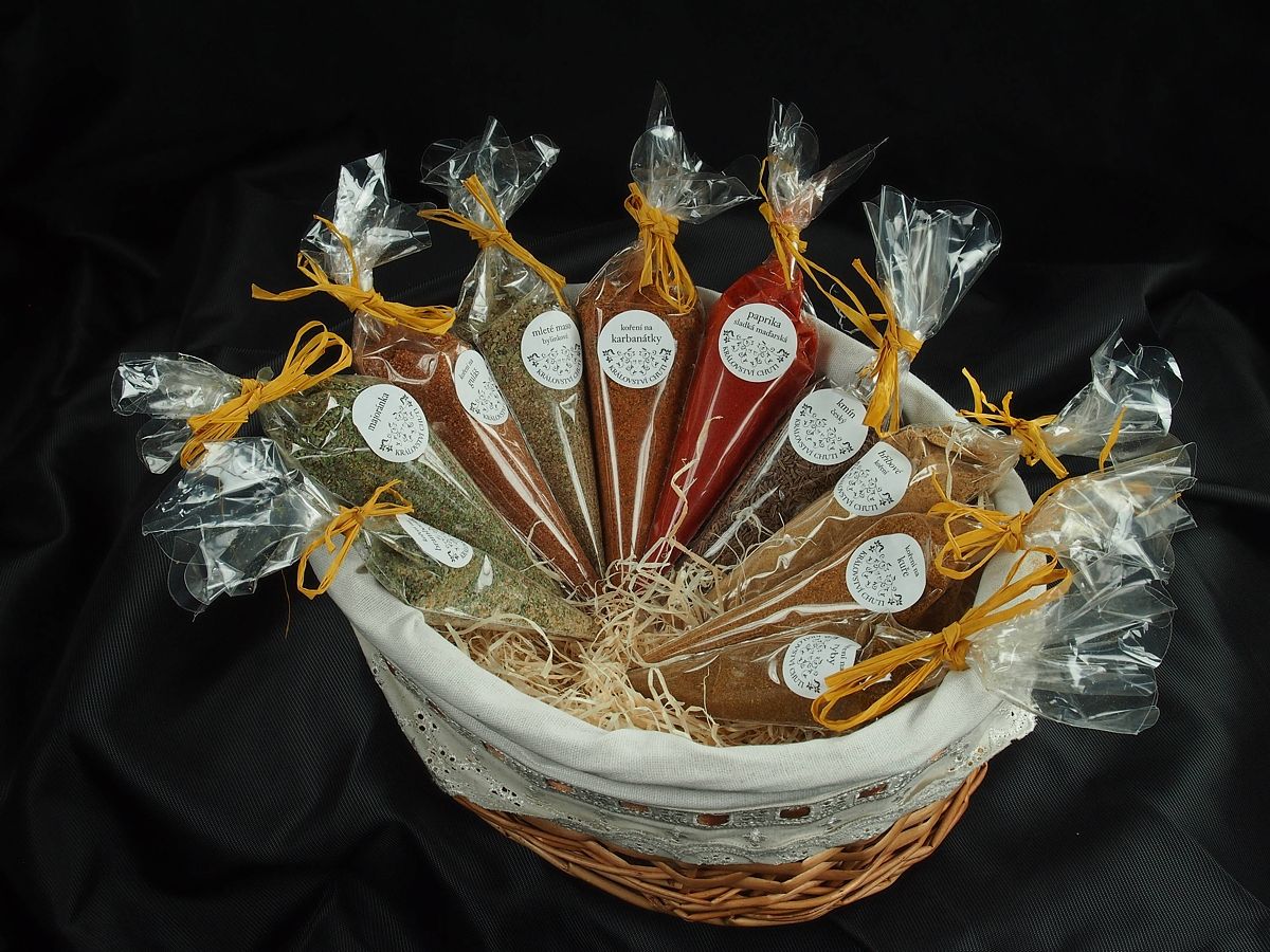 Dárkové košíky jsou jako dárek velmi oblíbené a s naším ne zcela tradičním obsahem zaujmou i originalitou. Je z čeho vybírat, nabízíme např. sady koření české, orientální či italská kuchyně, koření na sladké pečení, koření pro vegetariány či ostré koření, ale též sypané čaje, kávu, ořechy a sladkosti nebo třeba bylinky. Dárkový košíček je pak skutečně dárkem pro každou příležitost. Košíky lze vybírat z různých velikostí od košíčků na pět balíčků až po velké koše pro 50 – 80 položek. Široká možnost výběru velikosti košíku a jeho obsahu umožňuje snadné přizpůsobení dárku požadované ceně.