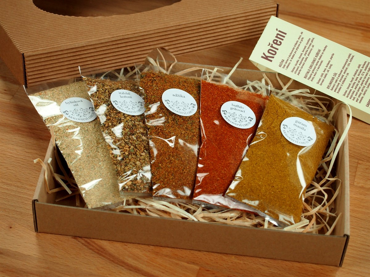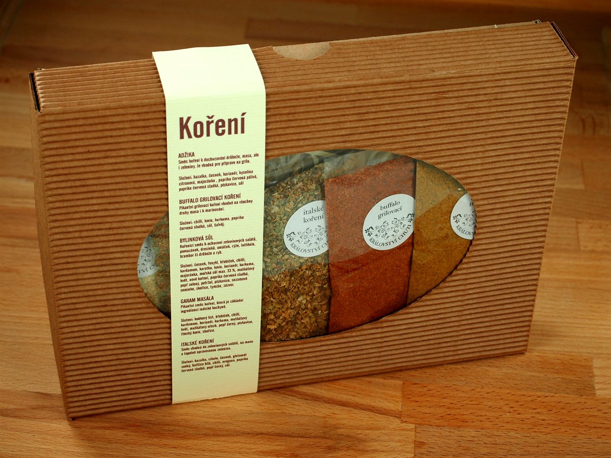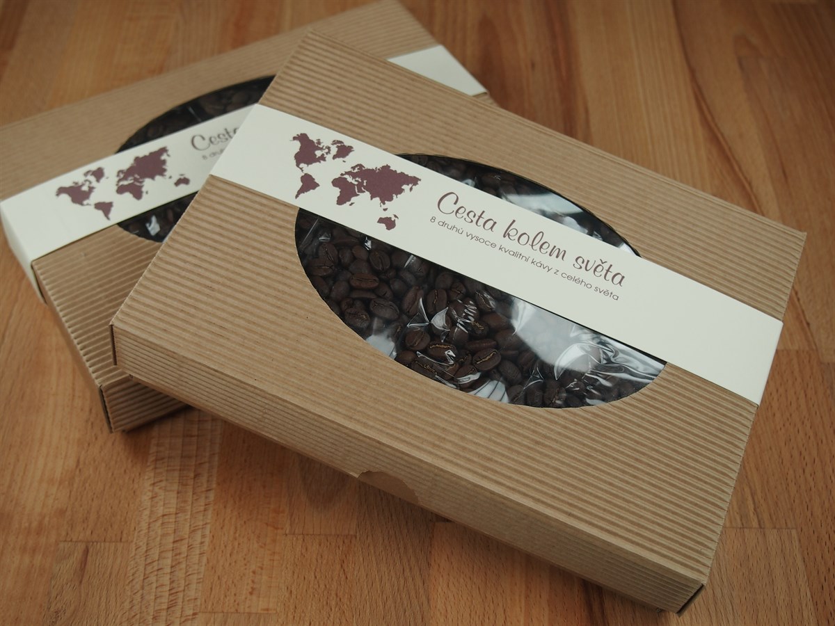 Papírová krabička v přírodní hnědé barvě působí velmi vkusným dojmem a vhodně se doplňuje se přírodním obsahem. Je opatřena průhledem, který odhaluje její vizuálně atraktivní obsah. Tím může být například výběr vzorků kávy, čaje či koření dle výběru zákazníka v transparentních sáčcích. Oblíbená je například Cesta kolem světa, která obsahuje kávu z různých zemí všech kontinentů. Krabička může být doplněna páskou či samolepící etiketou se zákaznickým motivem.