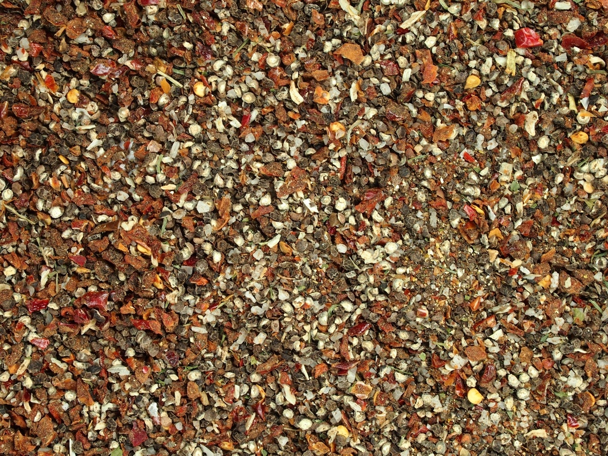 Hrubozrnná ostřejší směs na grilování. Obsah pepře 54 %, soli 20 %. Může obsahovat stopy celeru, sezamu a hořčice.