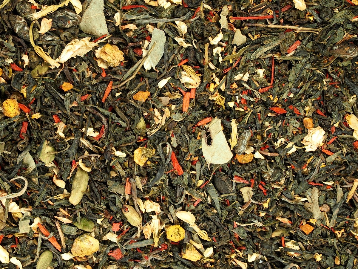 Složení: zelené čaje Sweet Flower, Yunnan Green, Formosa Gunpowder a Phoenix Eyes, pravý bílý čaj Snow Buds, kardamom, aroma, santalové dřevo, kurkuma, chryzantéma, jasmín, osmanthus, listy kari.