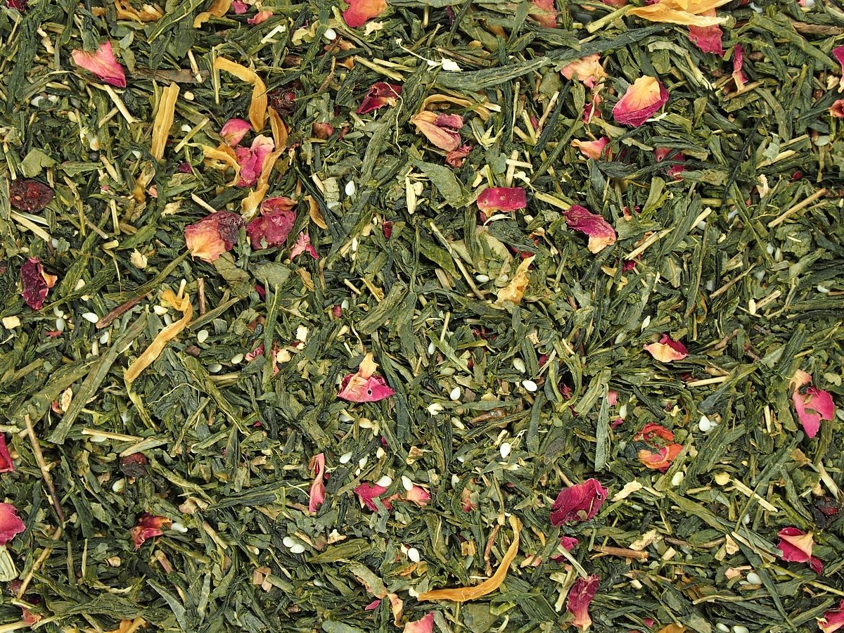 Pravé zelené čaje Sencha, China Bancha a Kukicha, sezam, bambusové výhonky, schizandra, zázvor, růže, aroma.