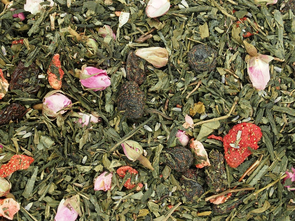 Složení: Pravý zelený čaj Sencha, rozinky (rozinky, slunečnicový olej), jahody (min. 6,1 %), poupata růží, aroma, levandule, aroma šampaňského (min. 0,5 %). Může obsahovat stopy suchých skořápkových plodů.