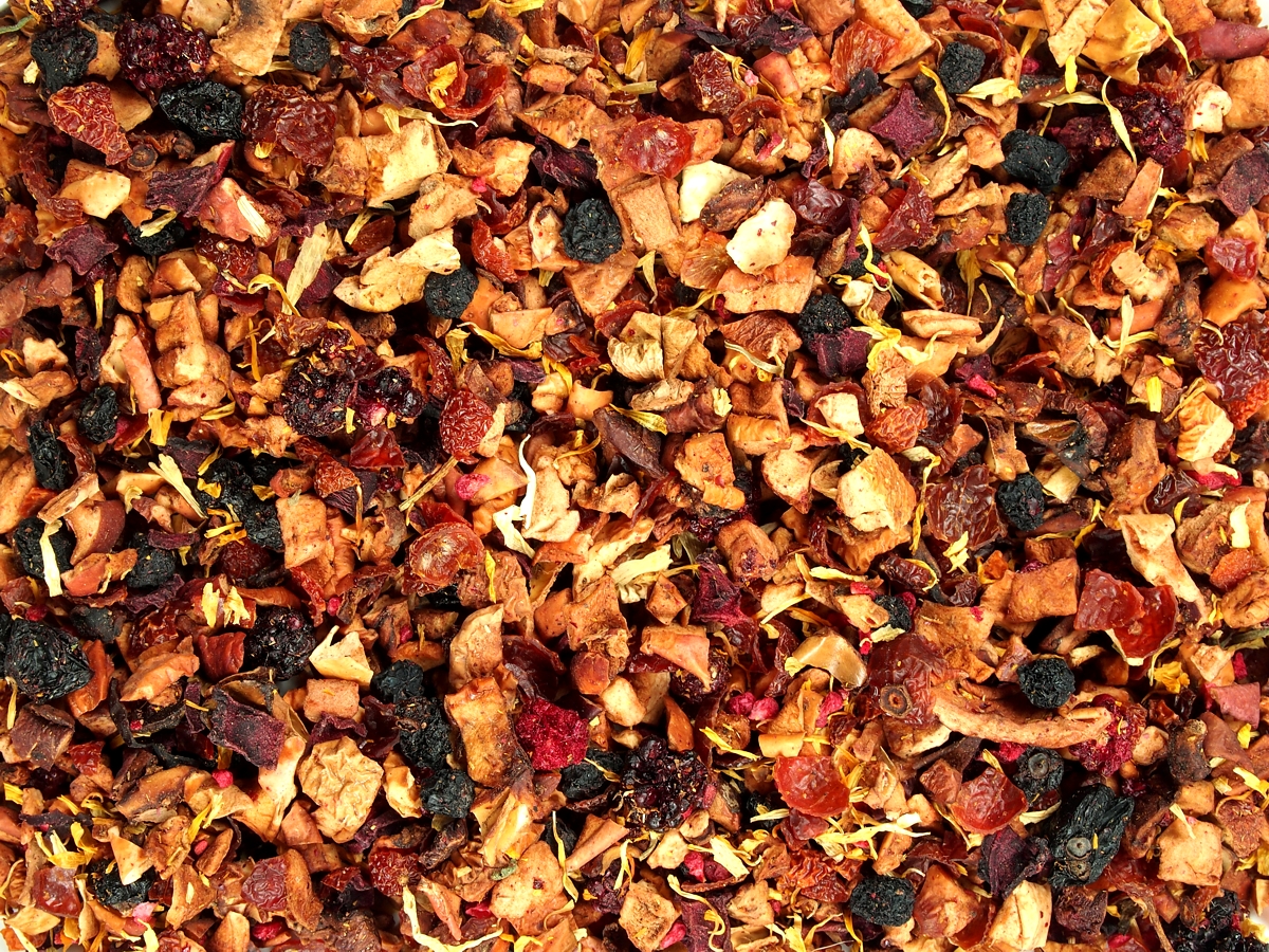 Ovocný čaj bez ibišku. Složení: jablka, šípek, aronie, černý rybíz, červená řepa, ostružiny, maliny (min 1,3 %), měsíček, aroma medu (min 0,3 %). Může obsahovat stopy suchých skořápkových plodů.