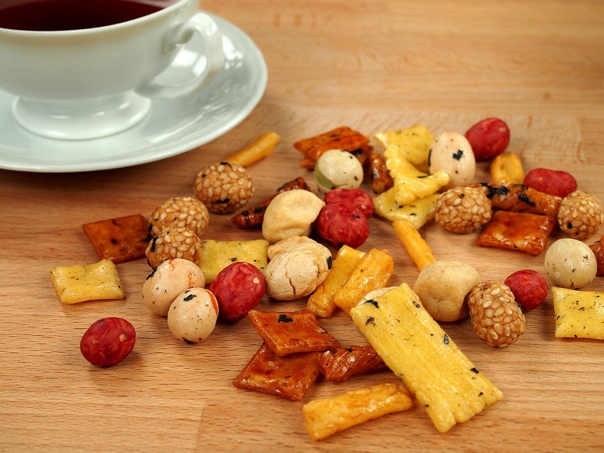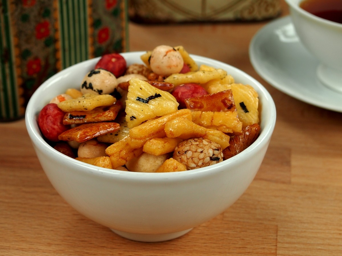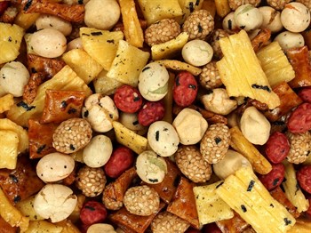 Složení: kukuřičná mouka, arašídy, pšeničná mouka, cukr, kukuřičný škrob, sezamové semínko, sojová omáčka (sojové boby, pšenice), koji, voda, sůl), bramborový škrob, dextrin, tapiokový škrob, palmový olej, E503ii, sůl, škrobový sirup, E500ii, mořské řasy, česnek, barviva: E140i, E163, E160c,konzervant: E330, cibule, barvivo E150a, kořenící extrakt