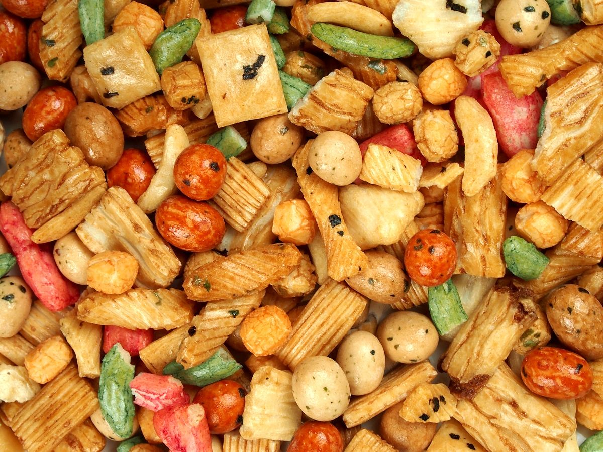 Složení: rýže (61,5 %), pšeničná mouka (9,3 %), arašídy (9 %), cukr, sezam (0,5 %), sůl, uhličitan amoný, mořská řasa (0,2 %), E150, tapiokový škrob, E160c, E141, glukóza, chili, E120.