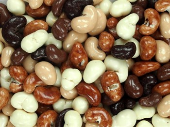 Směs jader kešu oříšků v jogurtu, tiramisu, karamelu, hořké a mléčné čokoládě.